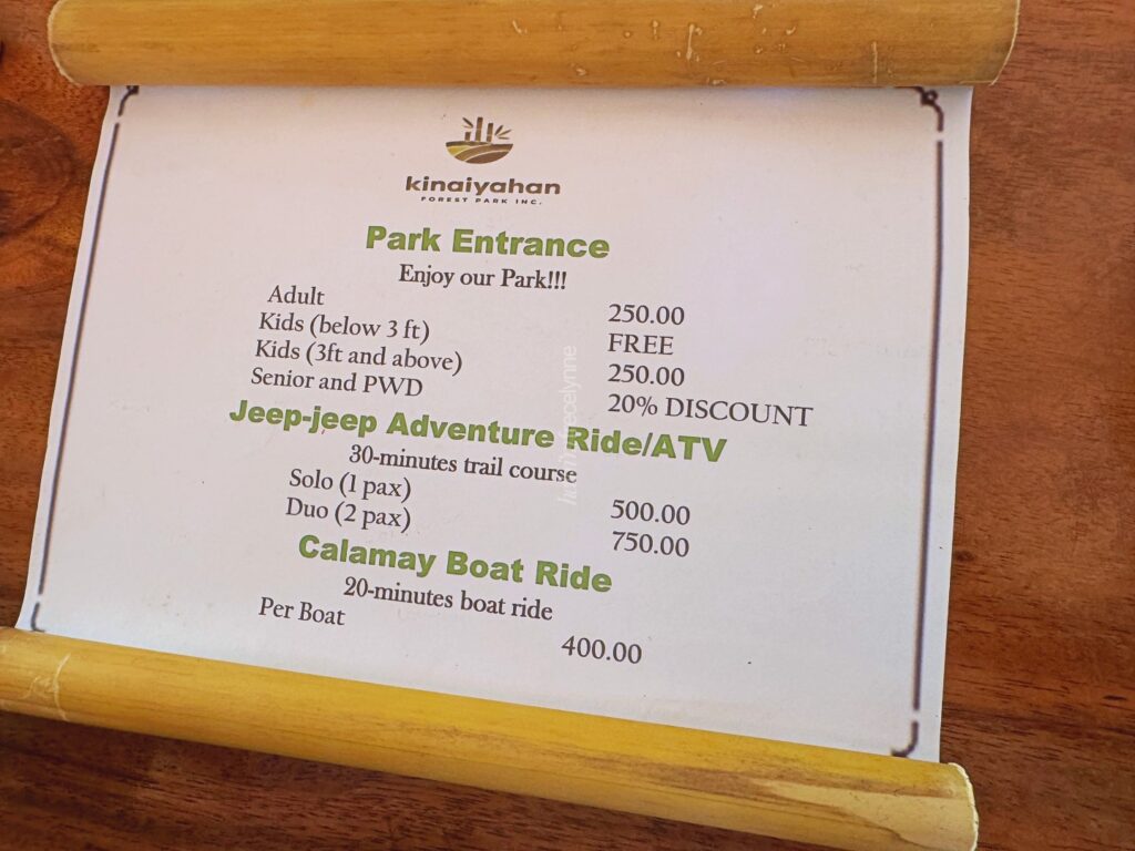 For the Jeep Adventure Ride or ATV, it’s PHP 500 for solo and PHP 750 for two riders on a 30-minute trail course. The Calamay Boat Ride is PHP 400 per boat for a 20-minute ride.