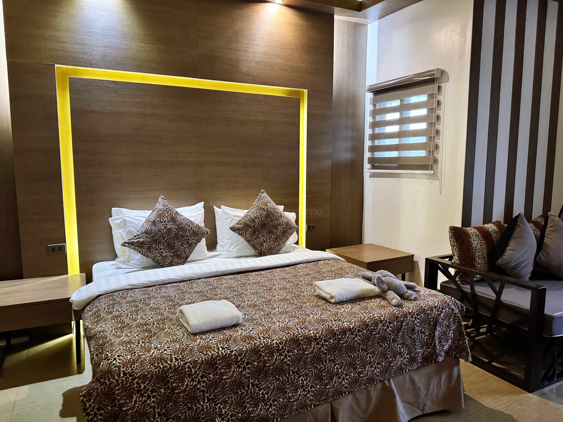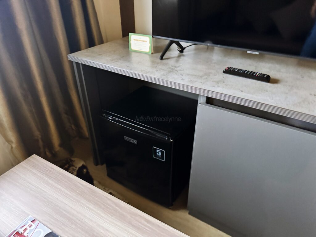 Inside the room were a flat screen TV, a wardrobe, a safe, a small ref, a microwave, and a water heater. There was one king-size bed and a small living area with a couch.
