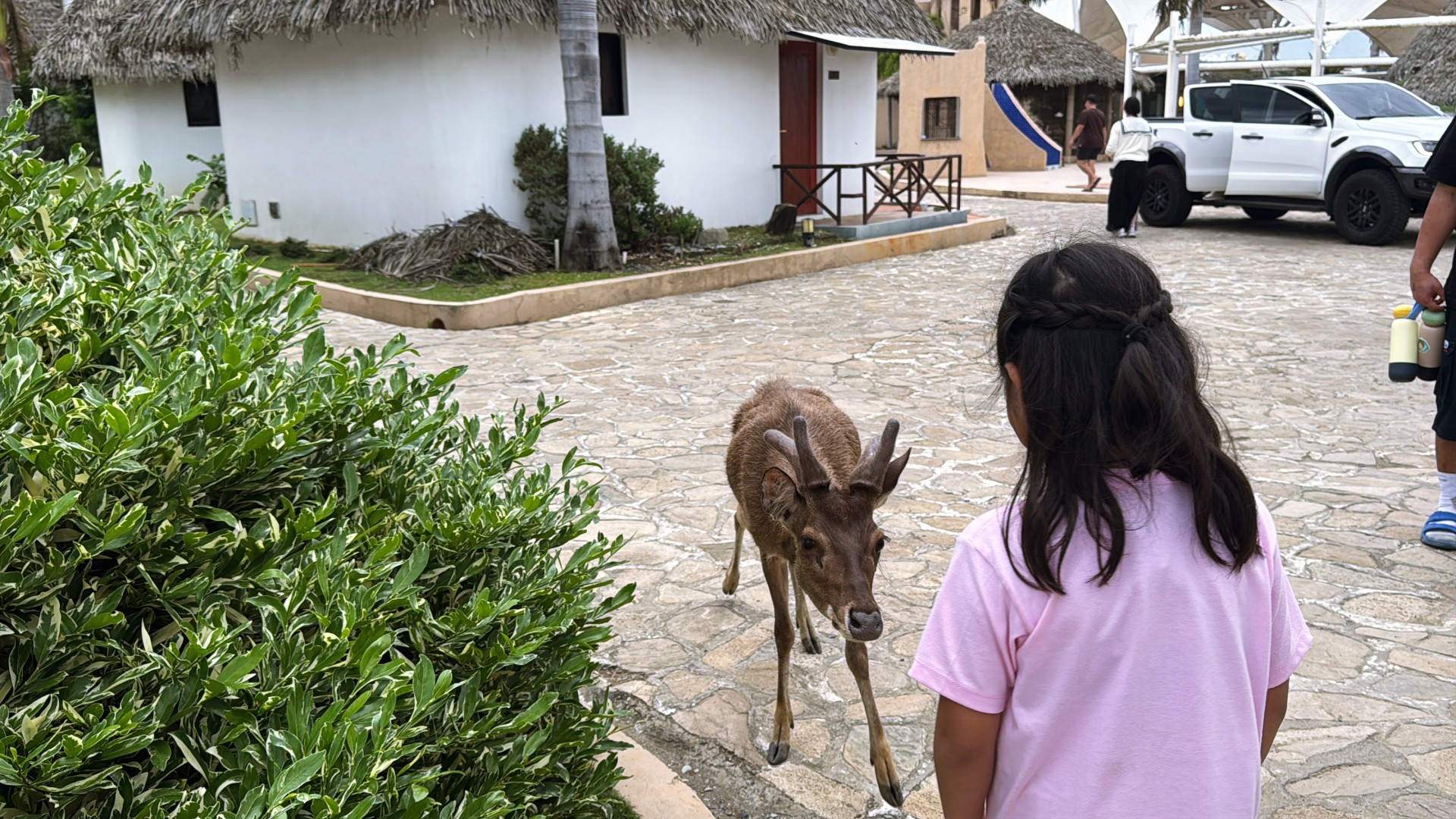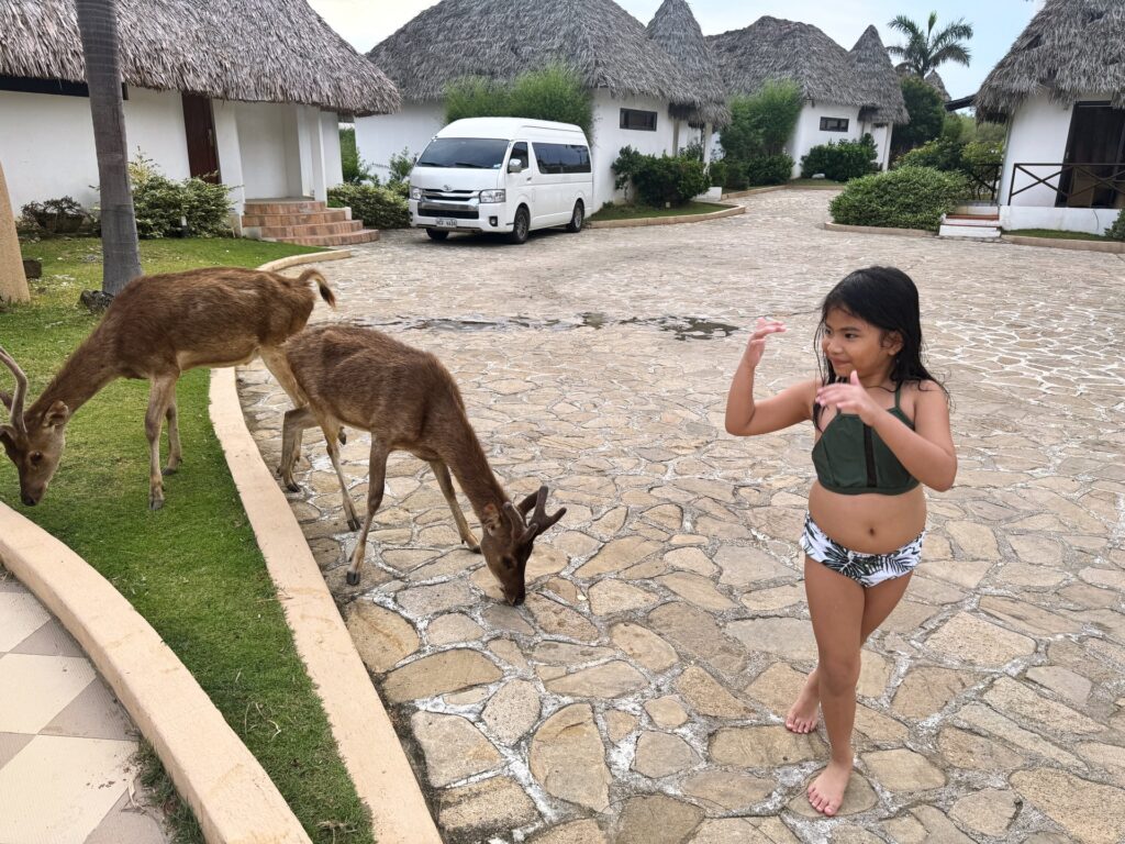 At the gate, the guard handed us a pass we needed for the entire stay. As we entered the property, animals walked freely around us. Audrey got excited when she saw the Indonesian deer up close. Some guests were even feeding them.