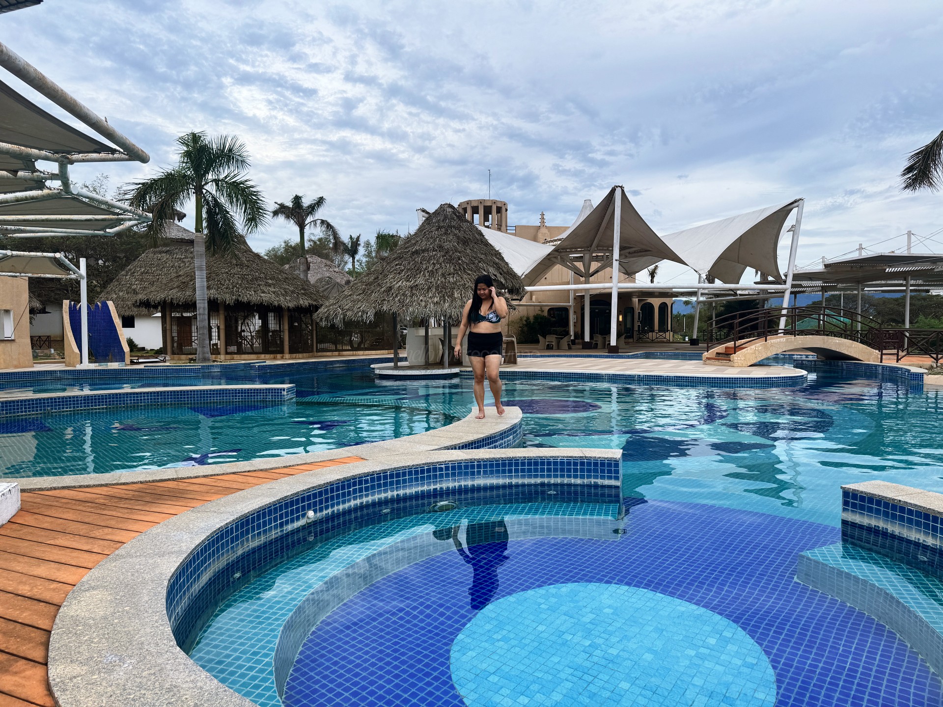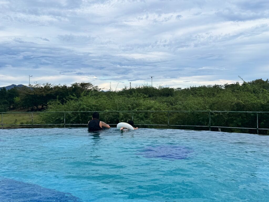 The pool looked dirty. The surface had not been cleaned for a while. There were unfinished construction areas nearby. I also noticed construction workers using the guest restroom near the pool. There was no clear restroom for men or women. The restroom also had no lights.