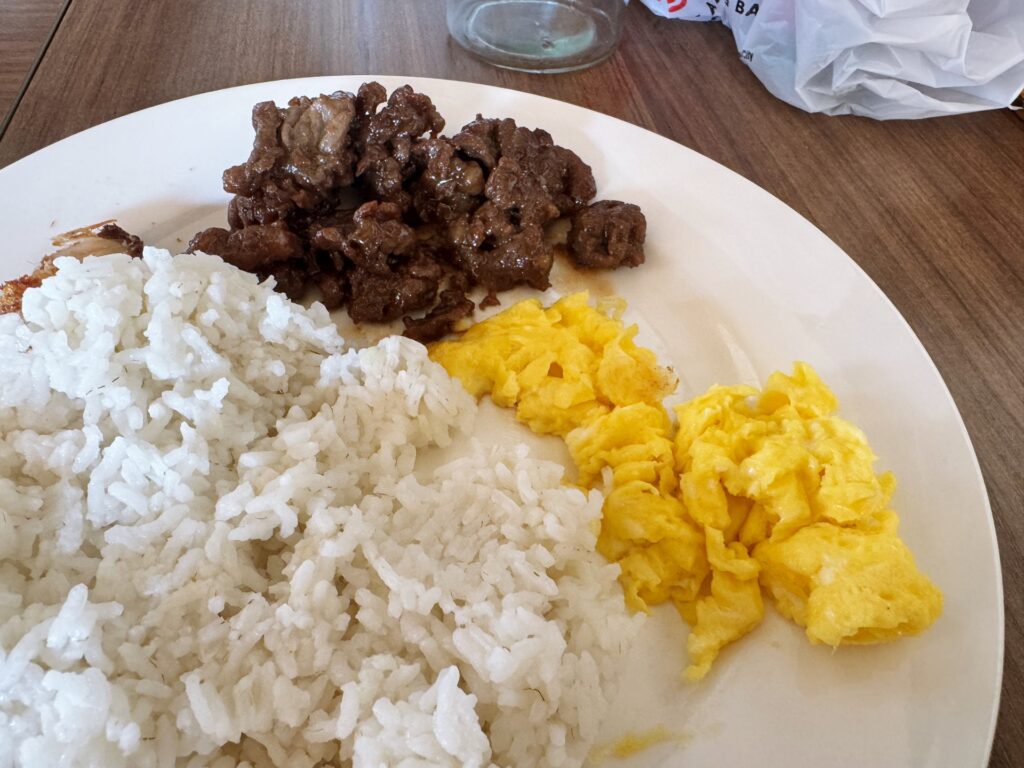 On day one, the spread included rice, boiled eggs, sautéed cabbage, daing na bangus, tocino, and bananas.