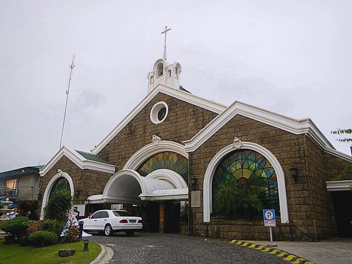 Known as the Twin Hearts Church, this parish in West Triangle, Quezon City draws attention for its gray stone brick exterior, triangular roofs, and colored windows. The brick driveway leads to heavy dark wood double doors, and a working fountain sits adjacent to the main entrance. Inside, marble floors lead to the altar, which is flanked by four grand gray pillars. An opening above the altar draws light directly onto the figure of Christ on the cross. The Chapel of the Nativity community was established as a new parish by Cardinal Jaime Sin on February 27, 1988, and renamed the Parish of the Hearts of Jesus and Mary.