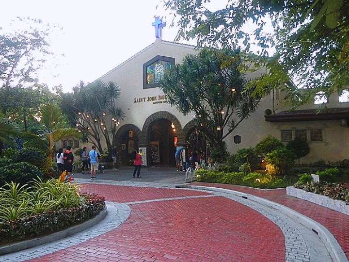 Formerly known as the Holy Family Chapel, Saint John Paul II Parish was established in 2012 in Eastwood City and belongs to the Diocese of Cubao. The church exterior is understated gray, with its identity carried through three interconnected entrance arches and its iconography. Inside, the cream marble floors lead to a three-panel altarpiece with a wooden altar, giving the space a warm and intimate feel despite its urban setting.